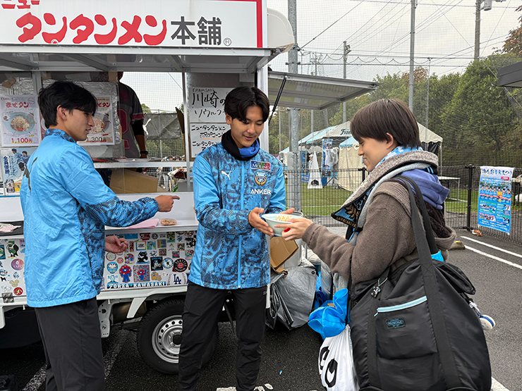 当日はあいにくの雨でしたが、開場後には温かい牛すじ煮込みや石焼き芋を手に、ほっとした表情で味わうサポーターの皆さまの姿が印象的でした。