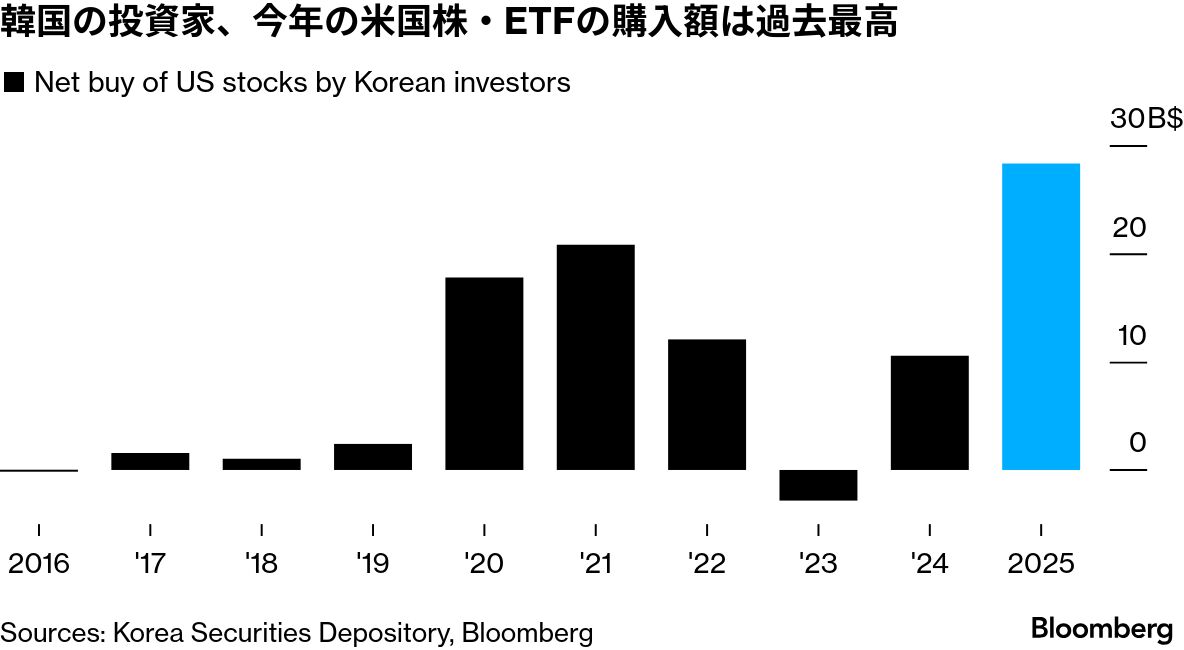 高いリスク志向で知られる韓国投資家の資金はここ数カ月、レバレッジ型上場投資信託(ETF)に向かっており、業績を伸ばしているテクノロジー銘柄の株価に連動する米上場ETFなどが人気だ。こうしたETFの人気化は世界的なトレンドだが、海外投資が資産を築く近道と見なされることの多い韓国ほどの熱狂ぶりは、他国ではほとんど見られない。
