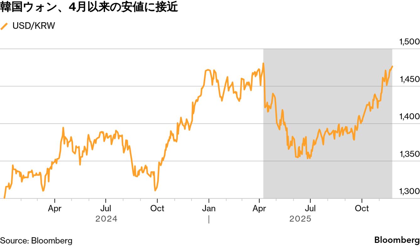 ウォンは一時0.5%安の1ドル=1479.40ウォンに下落し、貿易戦争の不安がピークだった4月9日以来の安値。新興国通貨の大半が今年はドルに対して上昇しているが、ウォンは下落で1年を終えそうな様相だ。