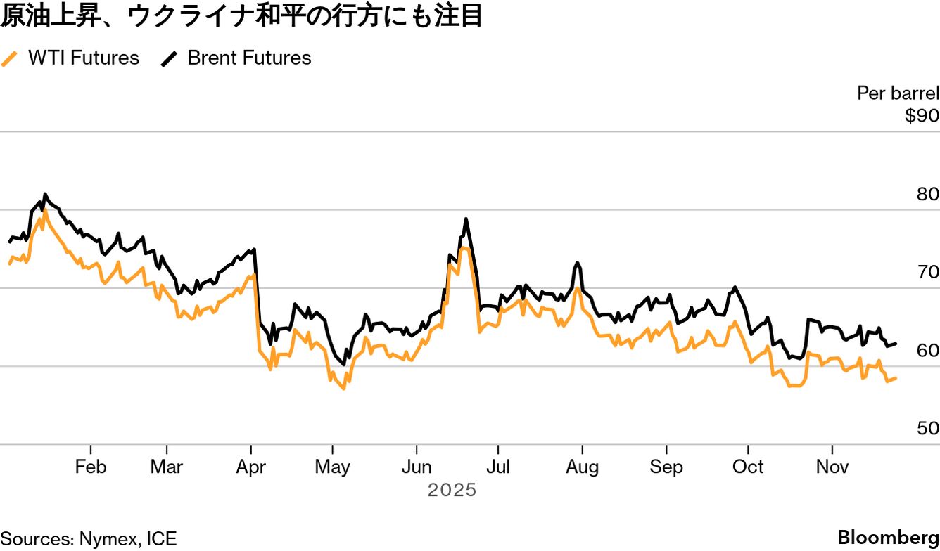 A/Sグローバル・リスク・マネジメントのチーフアナリスト、アルネ・ローマン・ラスムッセン氏は「27日の感謝祭を前に、原油市場は神経質な展開が予想される」と述べた。「週末にかけて和平合意、あるいは停戦の実現が近づいていることを示す材料が複数見られ、それが今週さらに価格を下押しするだろう」と語った。