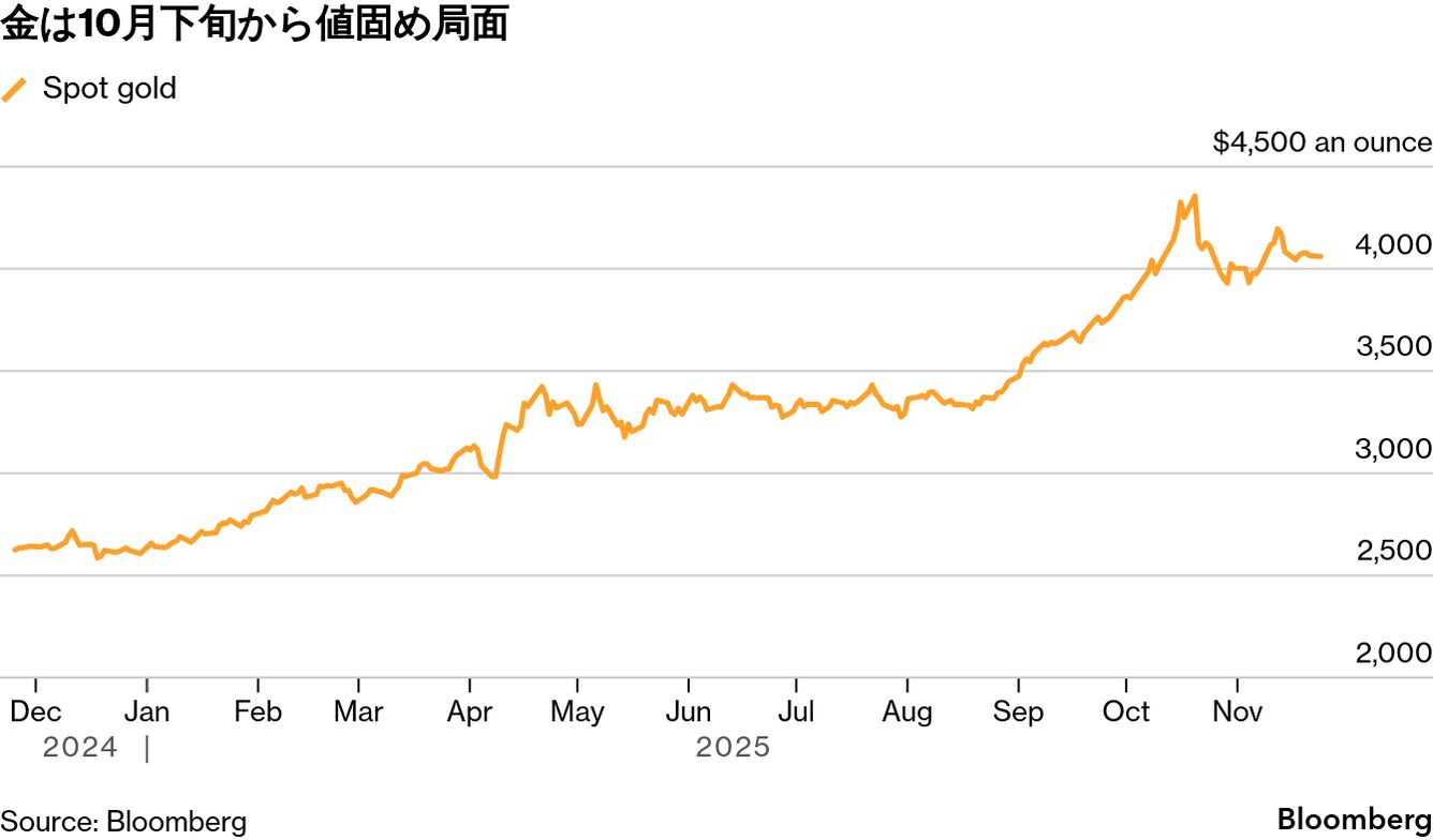 ペッパーストーン・グループのストラテジスト、アフマド・アシリ氏は、利下げの道筋は「予測が難しく、判断も微妙だ。そのため金価格は当面、現在の水準付近でもみ合う展開が続くだろう」と述べた。「金が早急に大きく動く兆しは見られず、むしろボラティリティーが低下する中で、上下どちらにも振れやすい状況になっている」と語った。