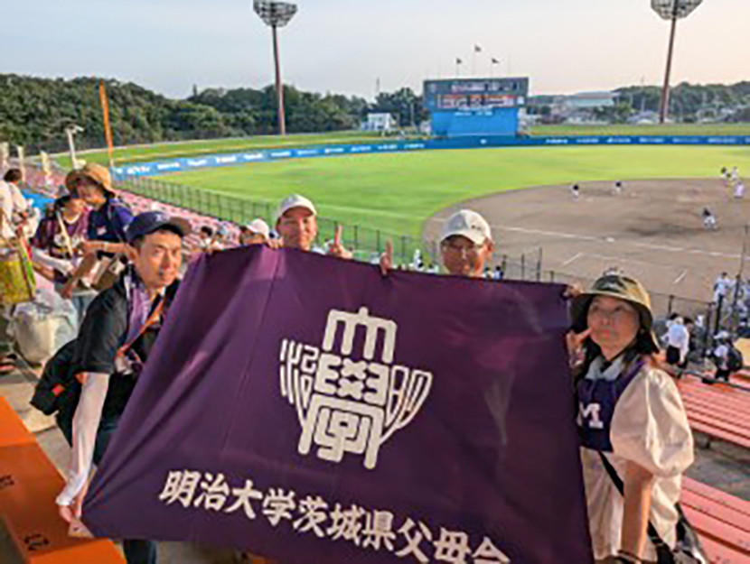 2025年度の野球応援活動は猛暑の茨城・水戸、東京六大学野球オールスター戦から始まりました。8.23一塁側に早稲田・慶應・法政。三塁側に東大・立教、そして明治。水戸でも明治父母会は立教の紫と一緒に紫紺のタオルをフリフリ。応援席をリードしたのが明治であることは想像にお任せします。埼玉・千葉・東京他各地区の父母会の皆様と大いに盛り上がりました。