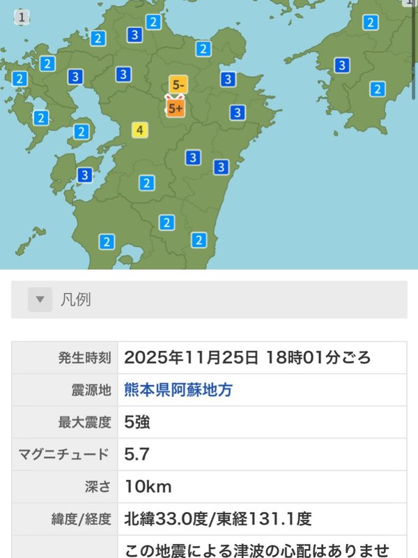 11/25熊本県産山村で震度5強の地震です。阿蘇市でも震度5弱。余震が起きる可能性がありますので、阿蘇地方を中心に地震を感じられた地域の方々は身を守る行動をお願いします。私もお出かけ知事室菊陽町を開催したところでしたが中止延期して県庁危機管理センターに戻る途中です。被害情報の収集等、今後の対応に万全を尽くすとともに熊本県から適宜的確に情報発信してまいります。