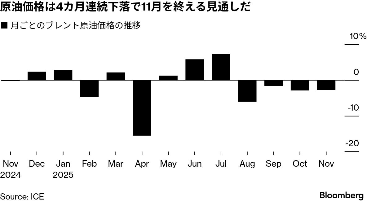原油価格は今年、下落を続けており、先物は11月、月次で4カ月連続と、2023年以来最長の下落局面になる見込みだ。石油輸出国機構(OPEC)と非加盟産油国で構成するOPECプラスによる増産の影響が大きい。ブルームバーグNEFによると、原油在庫は7月下旬以降、過去5年平均を上回る過剰状態が続いている。