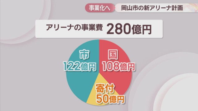 事業費280億円のうち国の交付金などで108億円、寄付で50億円を確保する計画で市の負担は122億円としています。