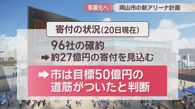 寄付は、市や経済界、プロスポーツチームが企業に依頼し、11月20日までに96社から約27億円が集まる目途が立ったとしています。市は、目標の50億円に向けて道筋がついたとの見解を示しています。