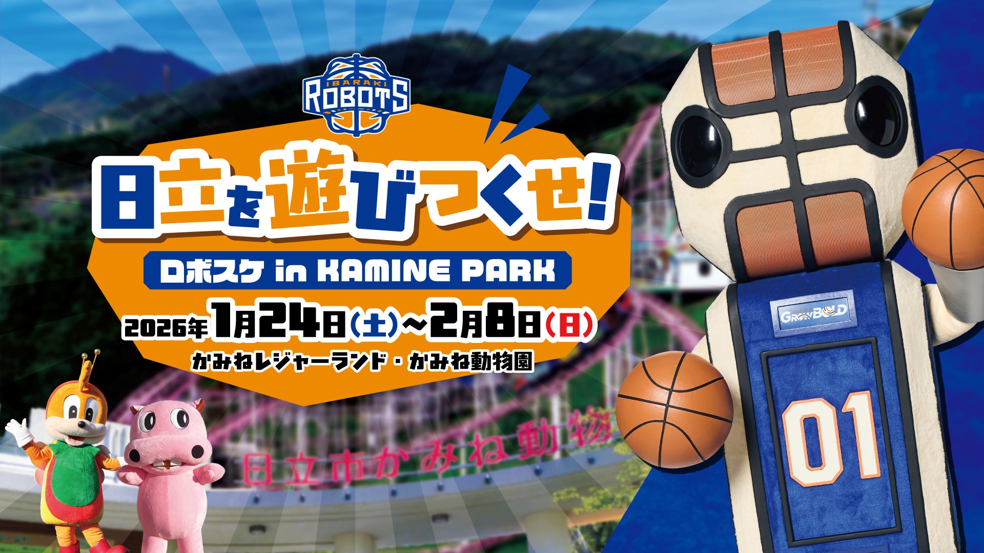 茨城ロボッツは、日立市にあります「かみねレジャーランド」「日立市かみね動物園」とコラボし 「日立を遊びつくせ!ロボスケin KAMINE PARK」を2026年1月24日(土)~2月8日(日)まで開催いたします。