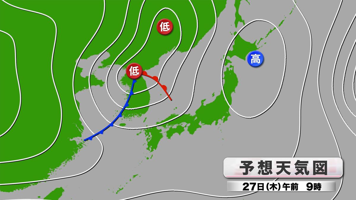 午後は広く高気圧に覆われて日ざしも期待できますが、あす27日(木)になると大陸方面から新たな低気圧や前線が接近し、天気は下り坂となります。