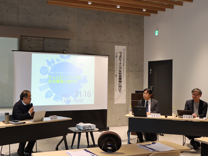 11月16日,先端科学・社会共創推進機構は,金沢市内において北陸4大学連携まちなかセミナー(※)「ウェルビーイングな社会構築に向けて」を実施し,一般市民や学内関係者など約20名が参加しました。