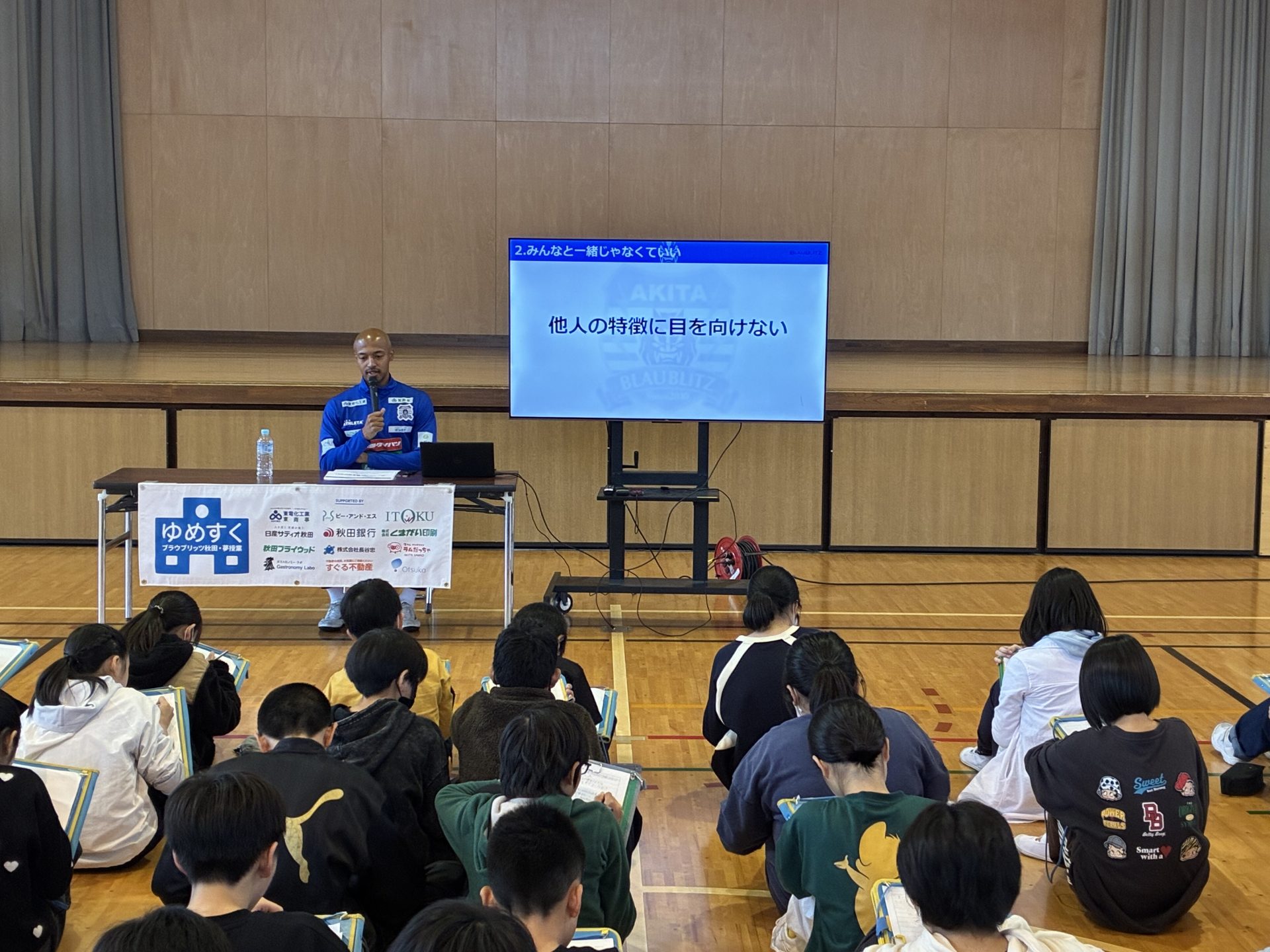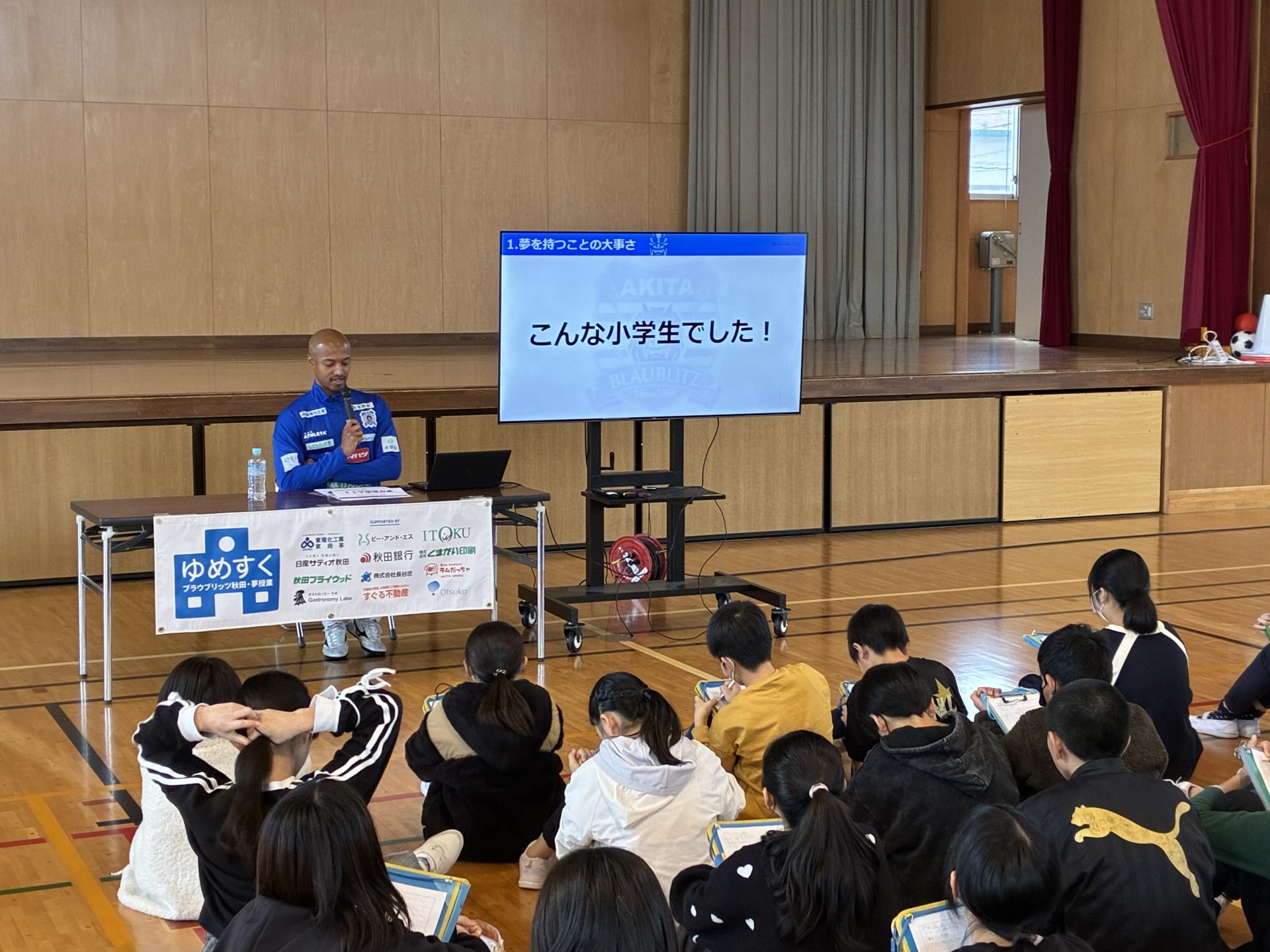 ブラウブリッツ秋田が、ホームタウン活動の一環として実施している「ゆめすく」は、ブラウブリッツ秋田の選手などが学校を訪問し、プロサッカー選手という夢を叶えた経緯を踏まえ「夢を持つことの大切さ」「夢を追いかけることの重要性」を伝える活動です。
