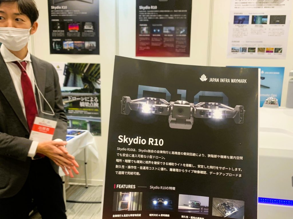 ジャパン・インフラ・ウェイマークは米SkydioのAIドローン「Skydio X10」や、専用の格納庫「Dock for X10」など点検ソリューションを展示しているが、ブースにはもうひとつ、日本市場向けには正式なアナウンスがない機体のポスターがある。屋内向けドローン「Skydio R10」だ。