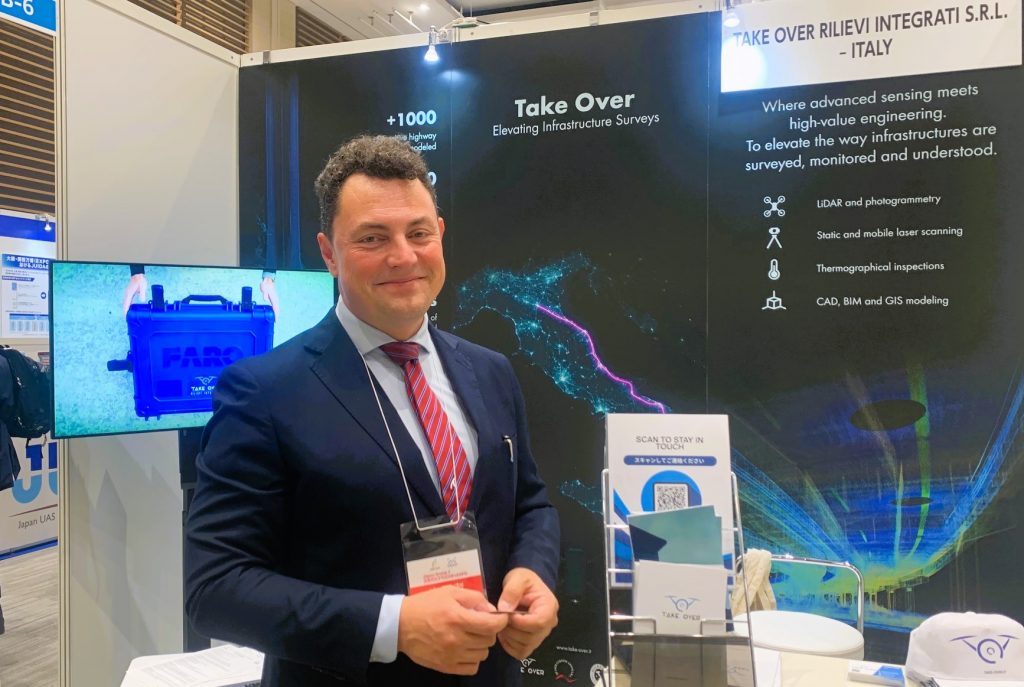 データ取得のためDJIを中心としたドローン、3Dレーザースキャナ、モバイルマッピングシステムなどを機材として使っている。JapanDroneのブースではFranz Lami CEO自身が来場者に実績、技術などをアピールし、情報収集、市場調査を進める。来場者には。同社のロゴの入ったキャップを渡している。最近東京に開設したオフィスの人員の増強にもつとめていて、リクルートにも積極的だ。