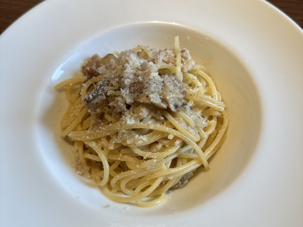 ランチは1,800円〜。前菜6品とメインディッシュ、パンがついてきます。取材した日のランチの前菜は6種。それぞれ特徴のある前菜を少量ずつ味わえます。なかでも印象に残ったのは、イタリア産の白インゲンにツナとドライトマト、バジルを合わせた前菜。酸味と塩味のバランスが良く、全体を引き締めていました。家でアレンジして作ってみるのもおすすめです。パスタは、「ポークと根菜煮込みをラグーソースで仕上げたパスタ」。柔らかな豚肉と根菜の香りがふわっと口中に広がりました。