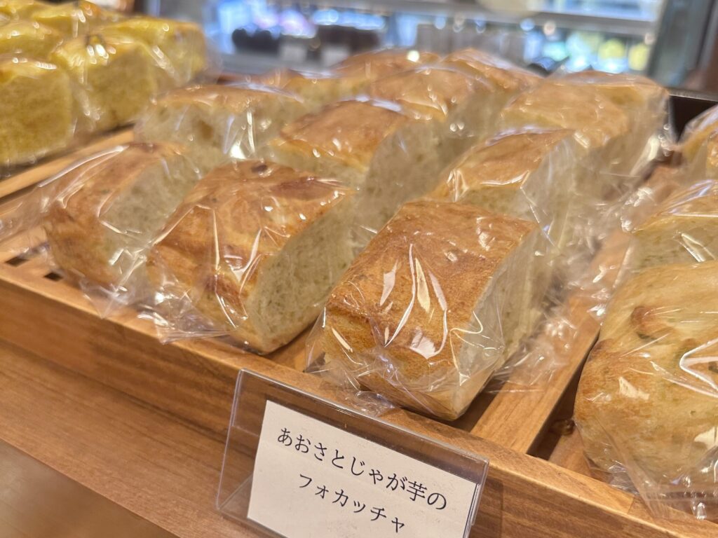 店内に一歩足を踏み入れると、セレクトショップにはオリーブオイルやフォカッチャ、ワインが並んでいて、華やかな雰囲気。最近は海藻を使った料理がトレンドですが、アオサが入ったフォカッチャが置いてありました。