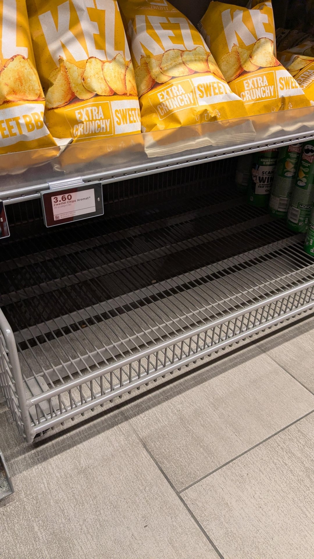 皆さん、これはコロナ禍でのトイレットペーパー不足よりもひどいです。 ミグロの店を 2 軒(MM と MMM が 1 軒ずつ)、Denner 店、そして大きな Coop スーパーマーケットに行ったところです。 どこも在庫切れ。従業員らはさらに注文したものの、需要が多すぎると話している。これらのアロマチップスを味わうことができるようになるでしょうか?試してみましたか?それだけの価値があるのでしょうか? 唯一良かったことは、毎日の歩数を超えたことです:) Switzerland