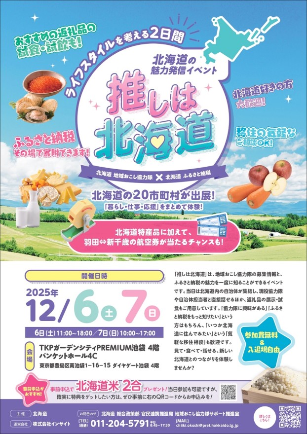 北海道への移住や地域おこし協力隊、ふるさと納税返礼品にご興味がある方は、ぜひこの機会に会場へお越しください。