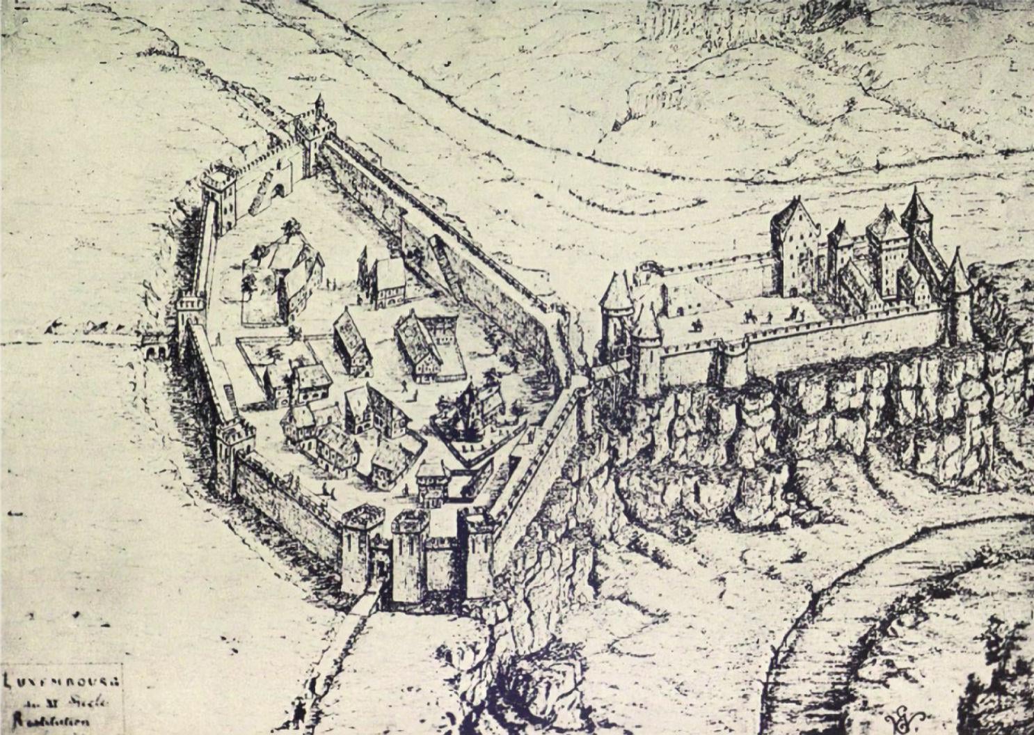 エルネスト・ヴァーリングの回想 "プロトバージョン" 11世紀のルクセンブルク市。 写真では、城の橋の隣にあるメッシェル教会とボックフィールズのジークフリッド城がすでに認識できます。 "ルシリンブルフク" と呼ばれた。 パフェンダルの左上には現在の主塔が建っている "3つの塔" 1050 年に建てられました。非常に古いフェストンクで現在も残っている唯一の塔です。 Luxembourg