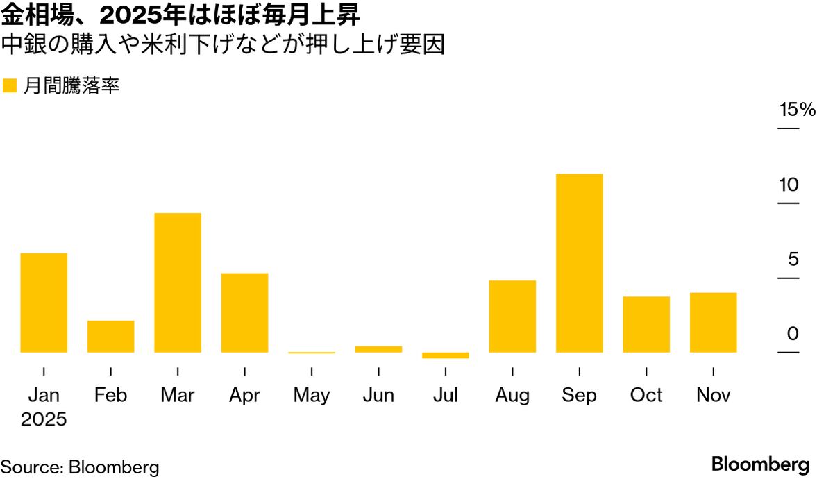 金は週間ベースでは約3.8%上昇。10月に最高値を更新した後、月間でも4カ月連続高となった。米連邦準備制度理事会(FRB)当局者による一連の発言や延期されていた経済指標の公表が、利下げ観測を後押ししている。利息を生まない金は、金利低下の局面で恩恵を受けやすい。