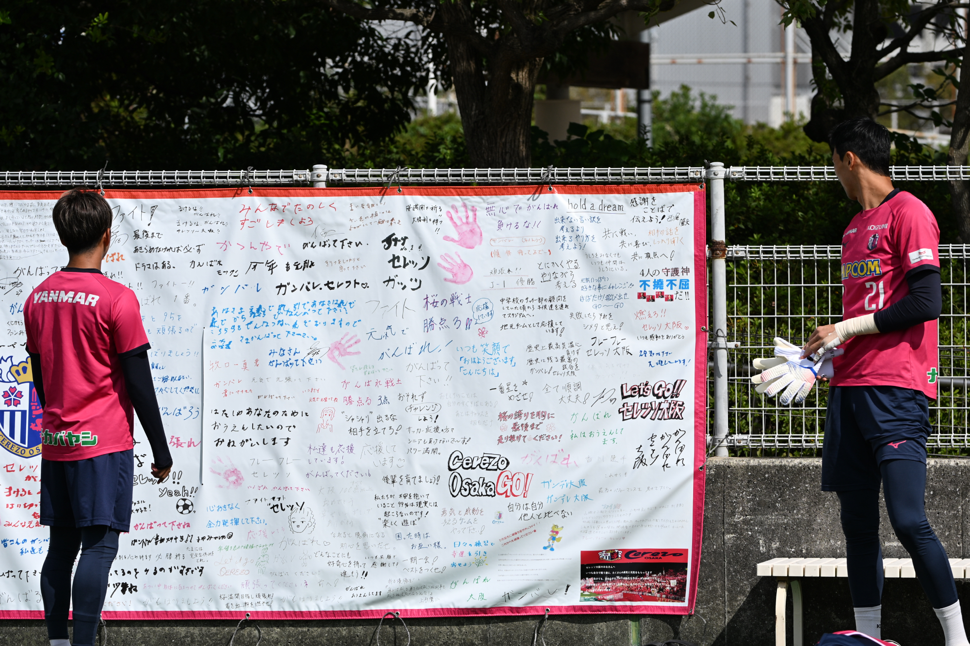 高齢者施設の皆さまをはじめファン・サポーターの皆様から寄せられた温かい応援メッセージを集めたバナーを、選手たちが日々練習を行う舞洲の練習グラウンドに掲出しました。バナーには、「けがに気をつけて頑張ってください」、「あなたたちの頑張りが私たちの元気です」など、施設の利用者お一人おひとりの想いが丁寧に込められています。選手たちはバナーの前で足を止め、手を振ったり触れたりしながら笑顔で写真撮影を行いました。その様子は練習後のひとときでありながらも、施設の方々からの応援を直接感じる大切な瞬間となり、「多くの方に支えられていることを改めて実感した」、「応援の気持ちに応えたい」といった声があがりました。この掲出は、クラブと地域、高齢者の皆さまとのつながりを象徴するものであり、まさに“人生の先輩からのエール”として、チームに大きな力を与える温かい光景となりました。