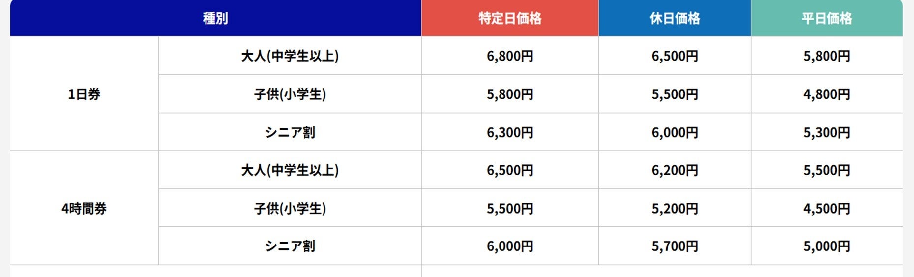子供(小学生) 特定日5,800円/休日5,500円/平日4,800円