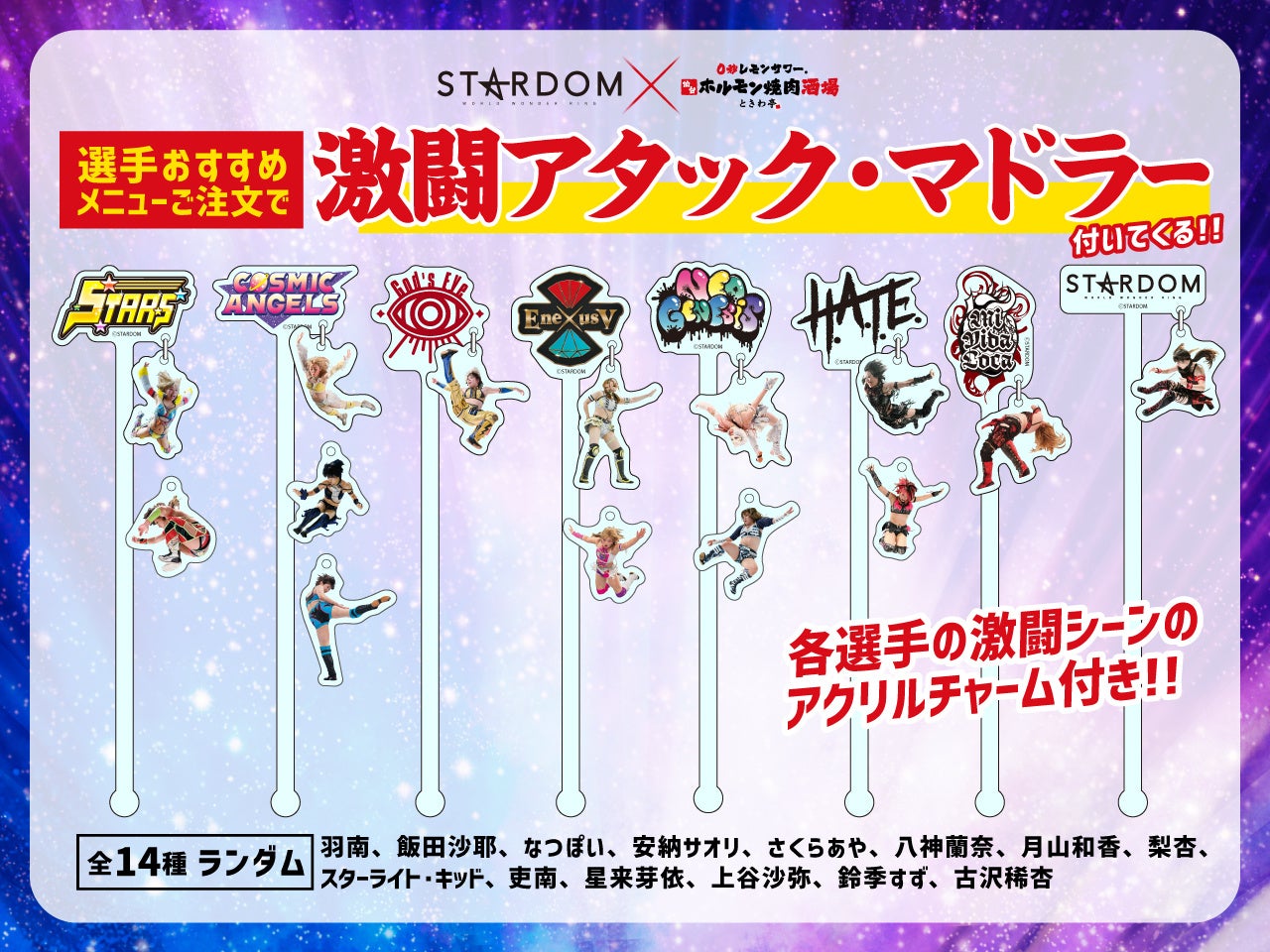 実施内容:期間中、対象店舗にてスターダム選手が選んだおすすめメニューをコラボメニューとして販売します。コラボメニューをご注文の方には、オリジナルノベルティグッズの選手マドラー(全14種ランダム)をプレゼントします。