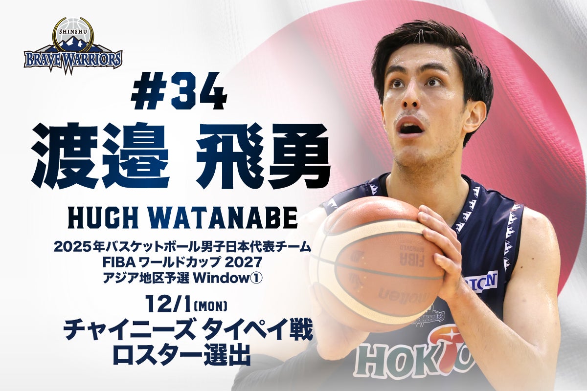 このたび、信州ブレイブウォリアーズより、#34 渡邉飛勇選手が11月28日(金)に続き、12月1日(月)アウェーで行われるに2025年度 バスケットボール男子日本代表 FIBAワールドカップ2027アジア地区予選Window1 チャイニーズタイペイ戦のロスターにも選出されましたのでお知らせします。