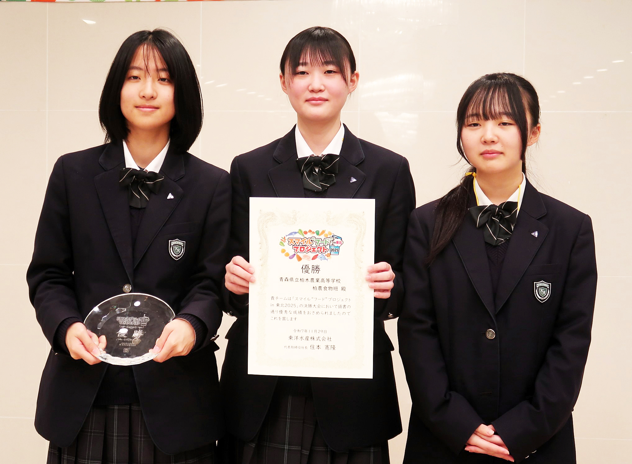 東洋水産が東北地区の高校生を対象に実施するスープレシピコンテスト「スマイル〝フード〟プロジェクト in 東北2025」の決勝大会が11月29日、仙台市の宮城調理製菓専門学校で開かれ、青森県立柏木農業高校「柏農食物班」が最優秀賞を受賞した。作品は「体が求める栗こ南瓜スープ」。同校の優勝は第1回以来2回目で、青森県代表としては通算4回目。準優勝は宮城県代表・常盤木学園高校自然科学部の「ずんだクリームスープ」だった。