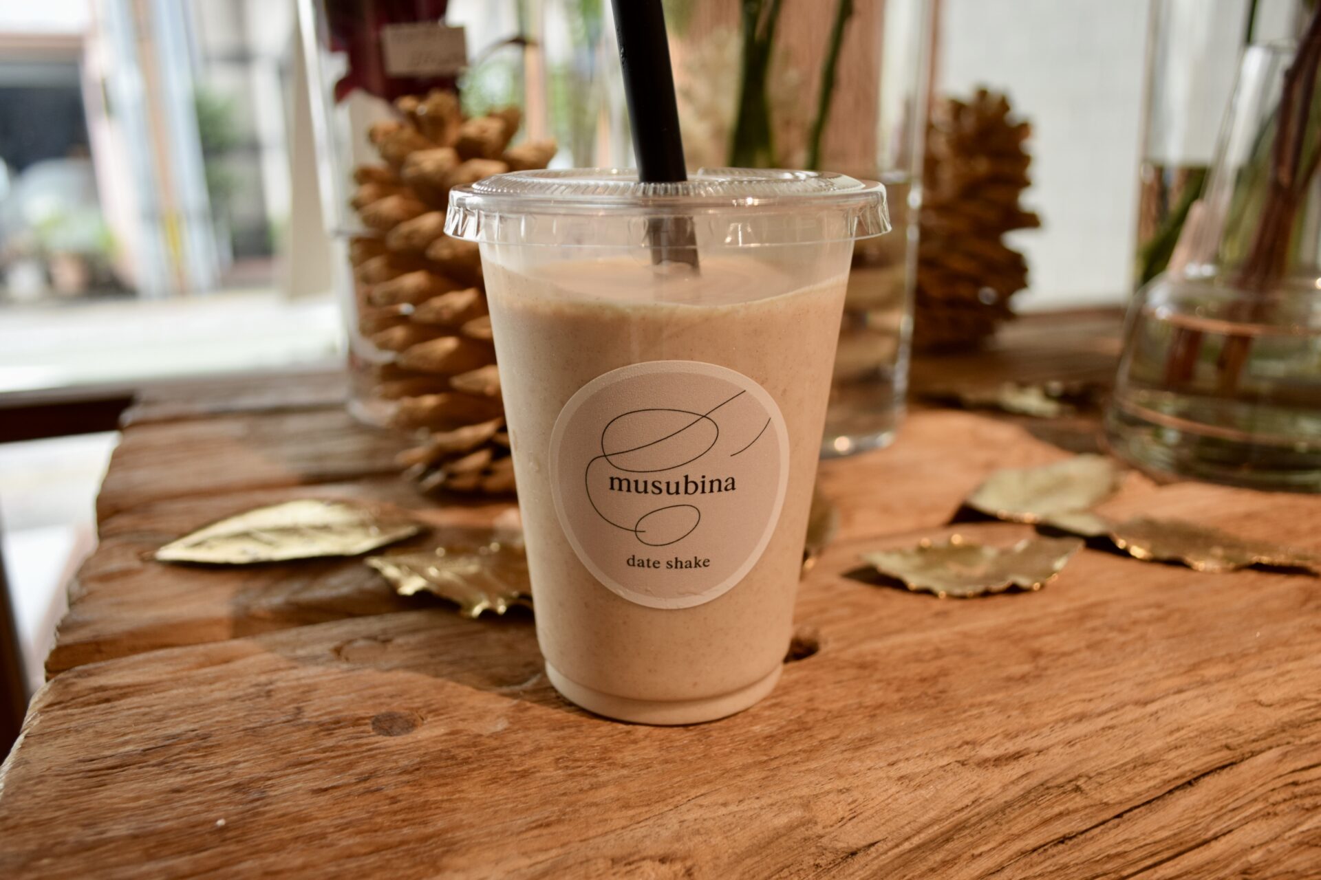 看板メニューの「デーツシェイク」は、砂糖を使わず、デーツそのものの自然な甘みを活かした一杯です。