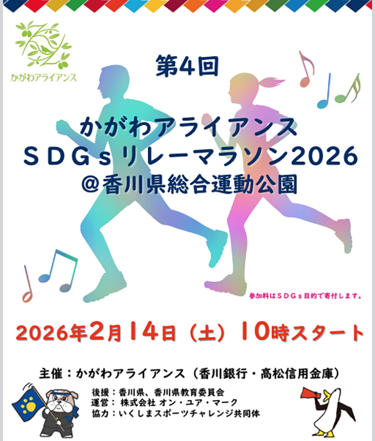地域金融機関である香川銀行(有木 浩頭取)と高松信用金庫(大橋和夫理事長)が連携して活動する「かがわアライアンス」は、地域住民の健康づくりとSDGsの理解促進を目的に、「かがわアライアンスSDGsリレーマラソン2026」を開催する。