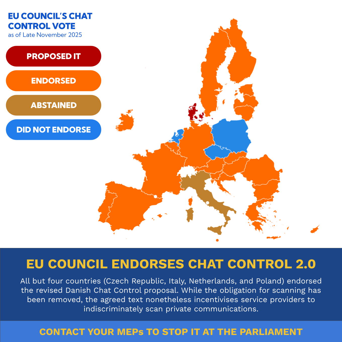 理事会がチャット制御を支持 4 か国 (チェコ共和国、イタリア、オランダ、ポーランド) を除くすべての国が、デンマークのチャット制御提案の修正案を支持しました。スキャンの義務は削除されましたが、それでも合意文はサービスプロバイダーにプライベートな通信を無差別にスキャンするよう奨励しています。