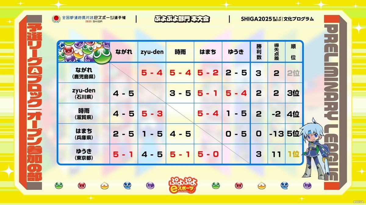 株式会社セガは、ジャパン・eスポーツ・プロライセンス認定タイトルである、対戦アクションパズルゲーム「ぷよぷよ」シリーズについて、2025年11月22日(土)、23日(日)に滋賀県で開催された「わたSHIGA輝く国スポ・障スポ 2025」文化プログラム「全国都道府県対抗eスポーツ選手権 2025 SHIGA ぷよぷよ部門」の滋賀本大会(決勝大会)にて、「小学生の部」で滋賀県代表のよし選手、「オープン参加の部」で東京都代表のゆうき選手が優勝したことをお知らせいたします。