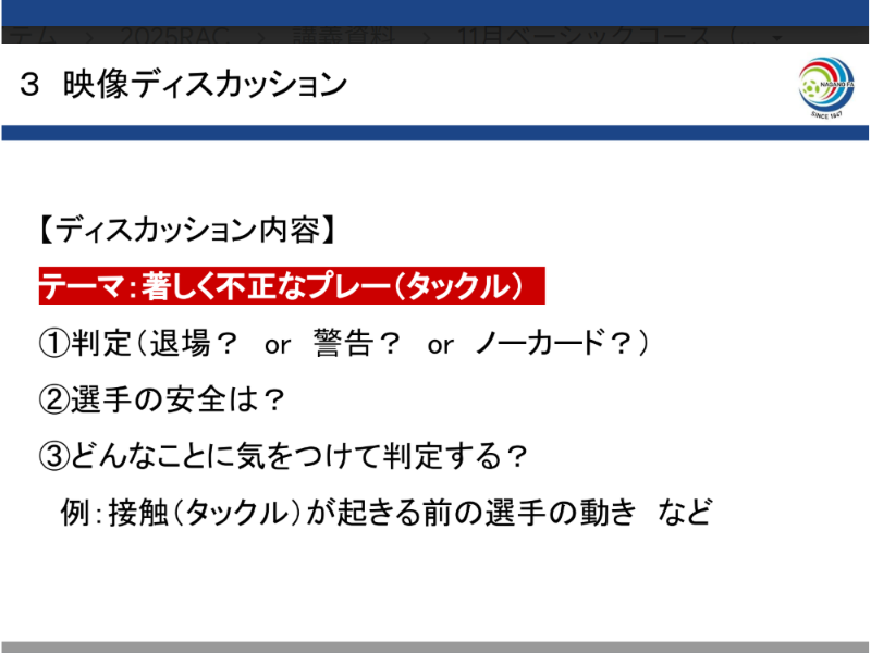 →退場と反則9項目中の【過剰な力(著しく不正なプレー)】【DOGSO(得点または決定的な得点機会の阻止)】にトピックを絞り映像で事象の確認をしました。