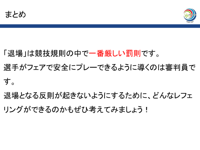 レッドカードは懲戒罰の中でも一番重いものということで試合中に出すのにも勇気のいるカードだと感じますが、競技者の安全やフェアにプレーさせるということを常に頭に置きながら警告を含め冷静に判断してレッドカードを出せるようにしていきたいと思いました。