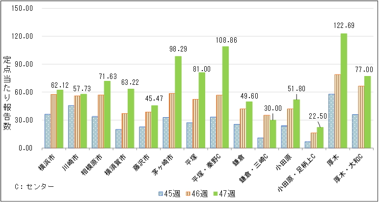 鎌倉保健福祉事務所三崎センターを除く全ての保健福祉事務所・センターで、前週に比べて定点当たり報告数が増加しました。