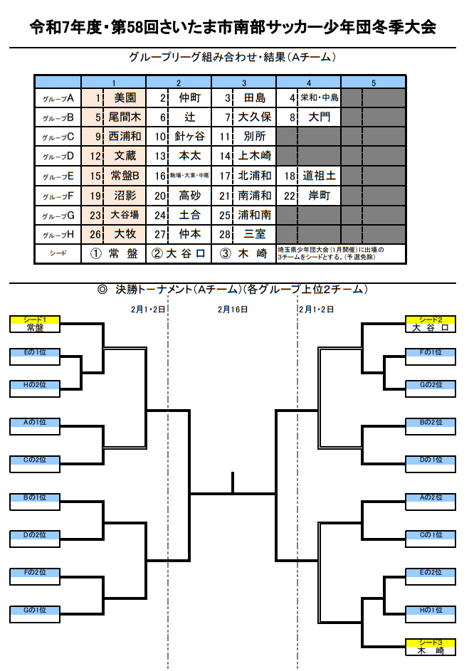 ・予選リーグ:参加チームを7ブロックに分け、予選リーグを行う。Aチームの埼玉県サッカー少年団さいたま市南部大会の代表3チームは 、1月に県大会が開催されるためシードとし、予選免除で決勝トーナメントからの