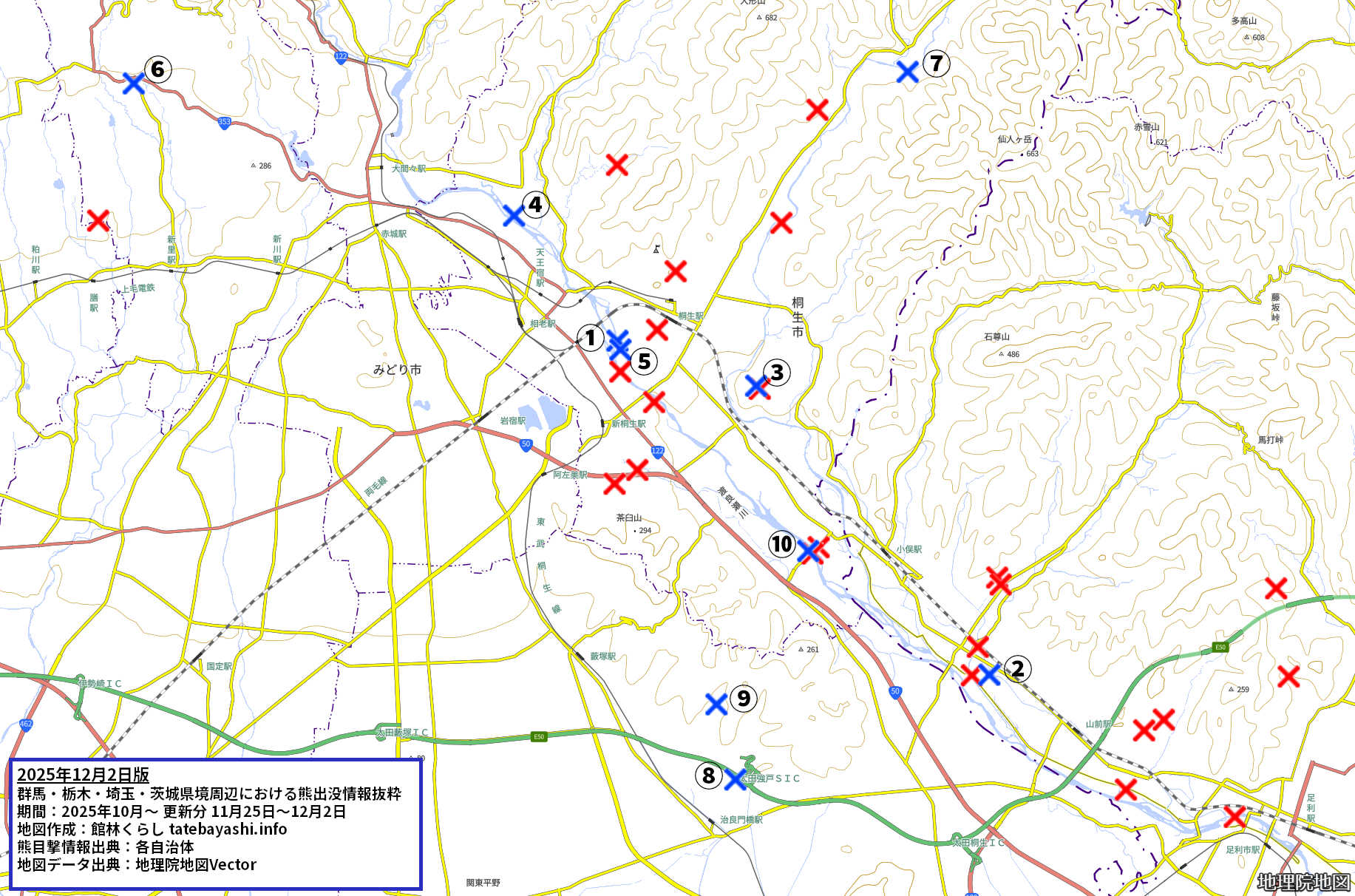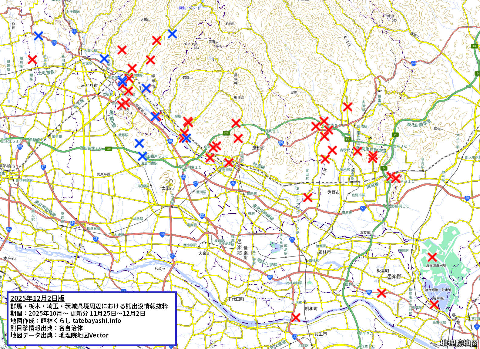群馬・栃木・埼玉・茨城県境周辺の熊出没情報 2025年11月25日版【桐生足利佐野他】