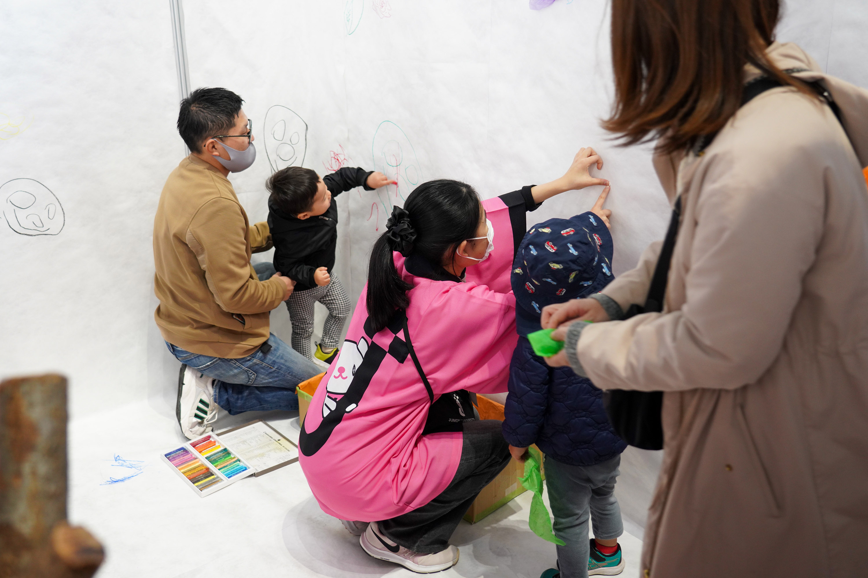 大学のブースでは、創作コーナー「にじいろひろば」を開催。幼児教育学科の学生たちが、来場した子供たちとふれあいながら、白い床面にクレヨンでお絵描きしたり色紙を壁に貼ったりと自由な創作遊びのお手伝いを行いました。学生たちは普段の学びの中で培った感性や企画力・表現力を活かしながら、たくさんの皆様とともに「子育てを楽しむ」機会を得ることができました。