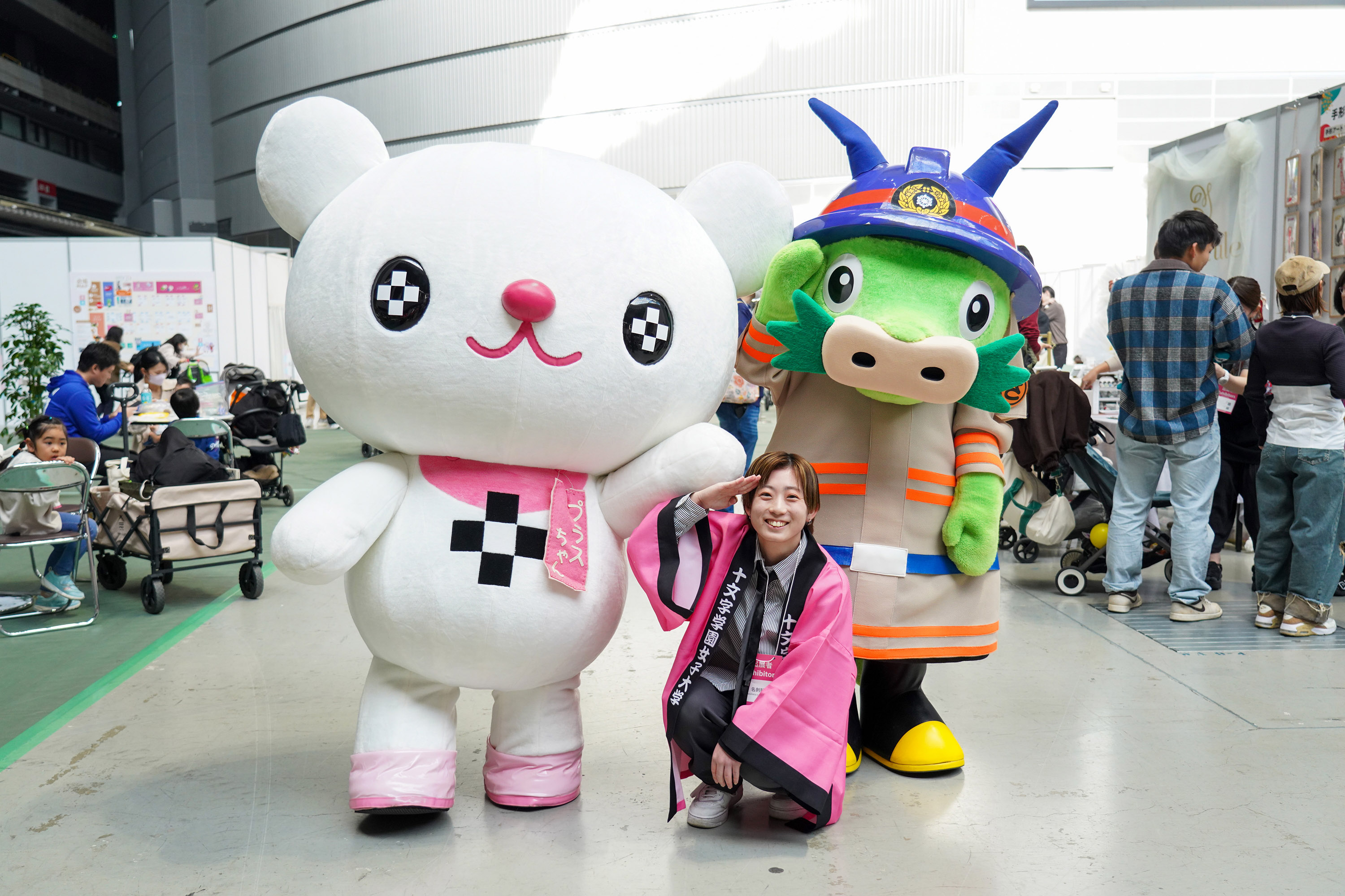 本学マスコットキャラクター「プラスちゃん」も会場に登場。本学ブース前でのご挨拶はもちろん、受動喫煙対策推進マスコット「けむいモン」 、さいたま市PRキャラクター「ヌゥ」(消防士ver.) と一緒にグリーティングを行い、会場を盛り上げました。