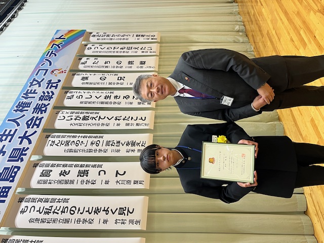 このたび、第44回 全国中学生人権作文コンテスト福島県大会の表彰式において、「福島ユナイテッドFC賞」を南相馬市立鹿島中学校の榎内 颯さんが受賞いたしました。