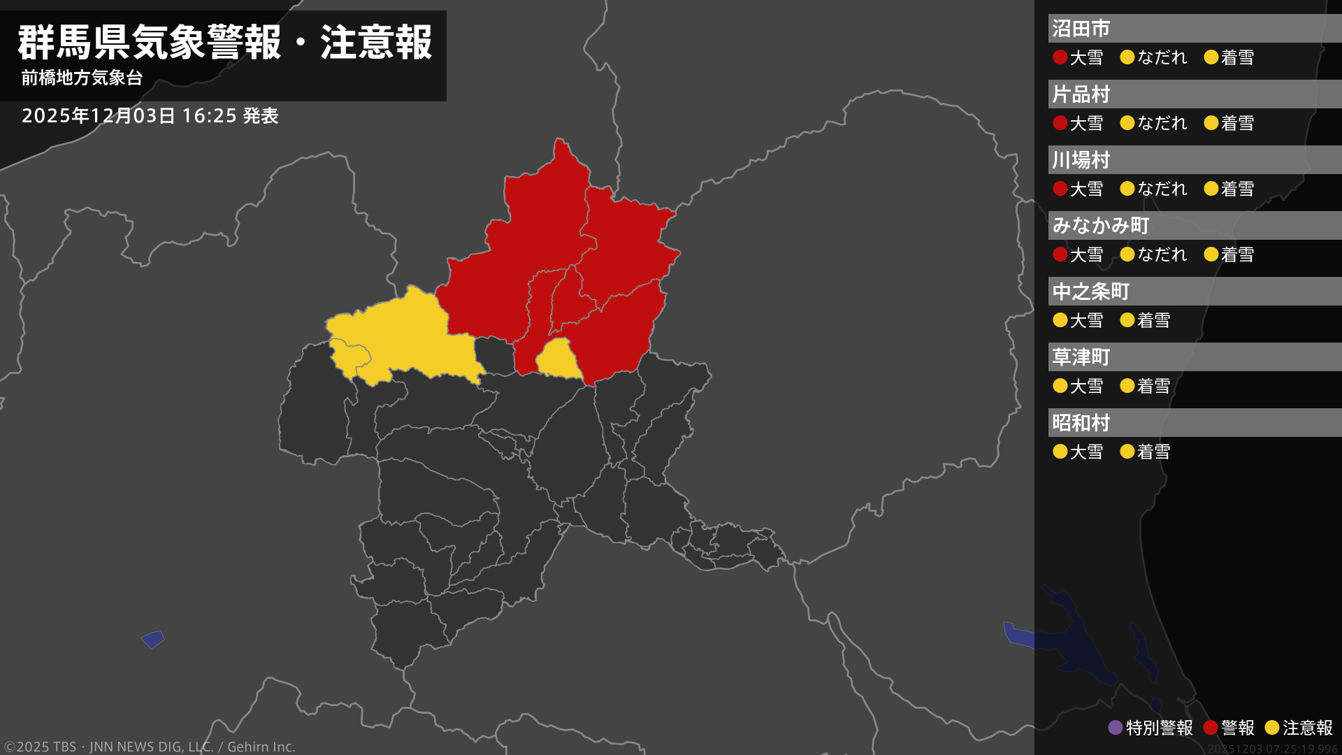 【大雪警報】群馬県・沼田市、片品村、川場村、みなかみ町に発表 3日16:25時点