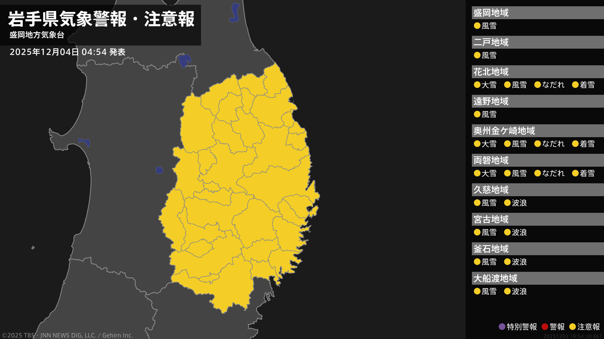 気象台は、午前4時54分に、なだれ注意報を花巻市、北上市、一関市、奥州市、西和賀町、金ケ崎町に発表しました。
