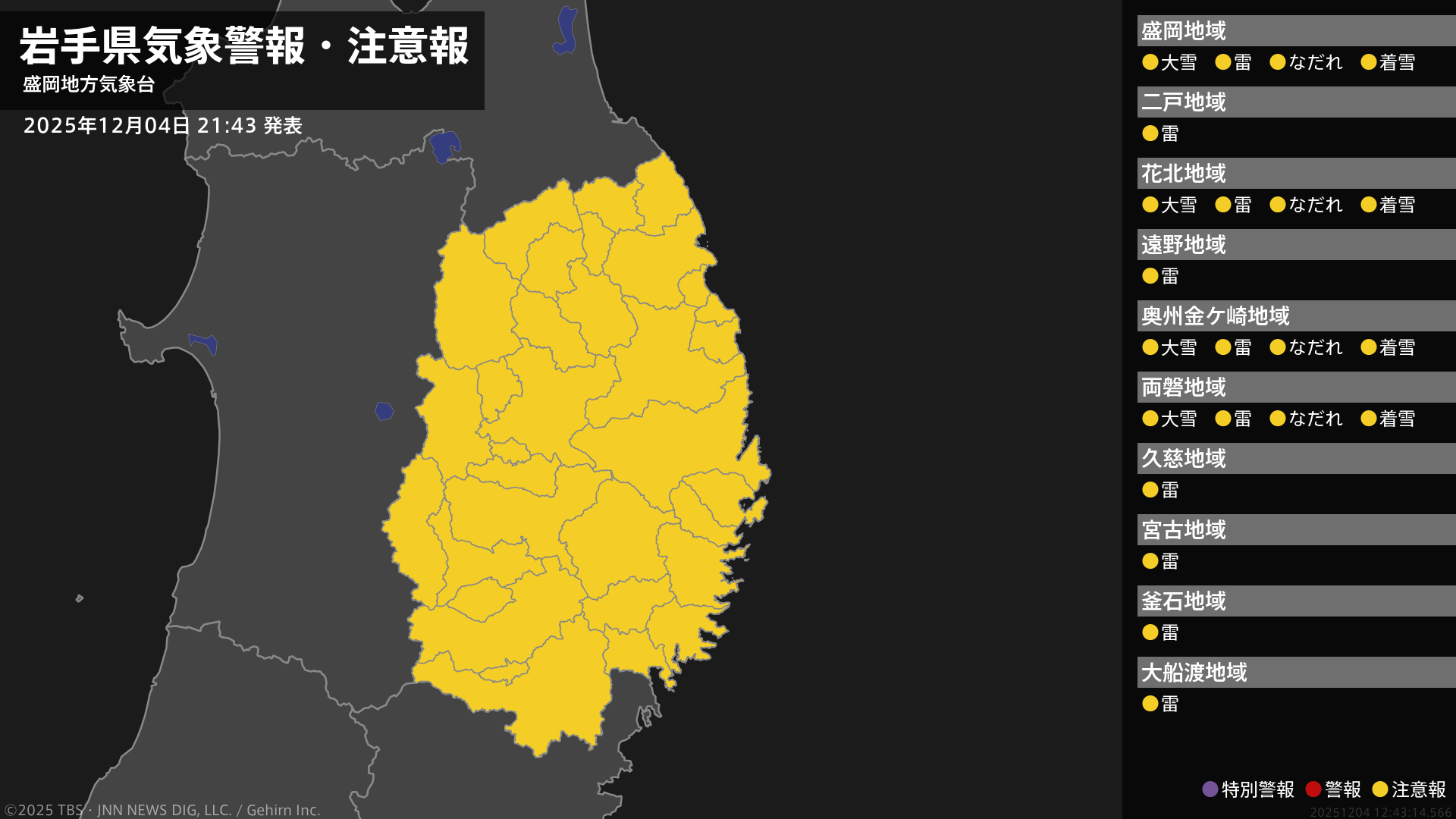 気象台は、午後9時43分に、なだれ注意報を盛岡市、八幡平市、滝沢市、雫石町、葛巻町、岩手町、紫波町、矢巾町に発表しました。