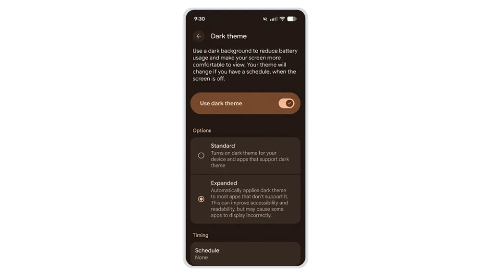 ダークテーマに対応しないアプリも含めて大半のアプリで、自動的にダークテーマをオンにできる機能を追加した。本機能はAndroid 16でのみ利用できる。
