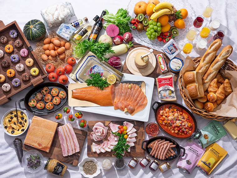 前菜やサラダ、ブレッドやクロワッサン、スウィーツなど約100種類が並びます。美星町産「豚珍甘」のソーセージやポタージュ、にぎりたてのおにぎり、ほうじ番茶がゆなど和食も充実。