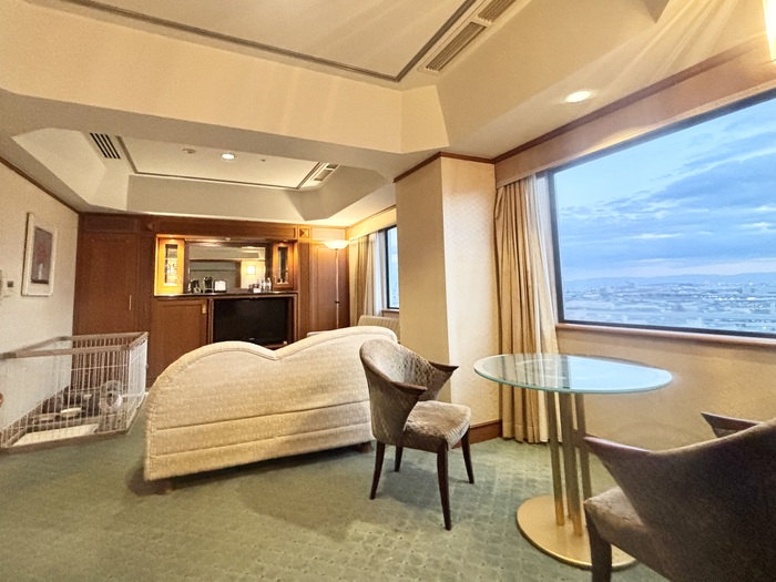 広々としたジュニアスイートルーム(19階・64.4㎡ 海側)。客室にはワンちゃんのための備品を完備しております。