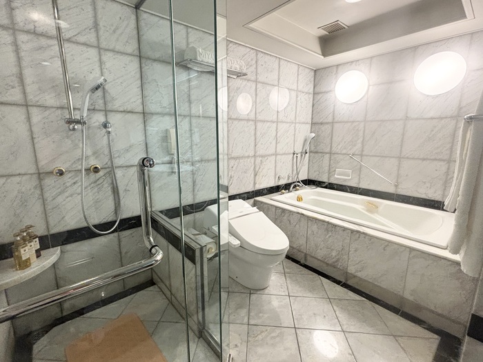大理石の豪華なバスルーム。シャワールームは独立タイプで、シャワーヘッドやヘアドライヤーはReFaを採用しています。ゆったりと足を伸ばせる浴槽にてリラックスタイム。