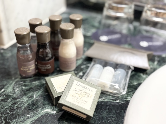 バスルームには、おしゃれなアメニティもご用意。可愛らしいパッケージデザインと、いい香りに包まれて、くつろぎのバスタイム。