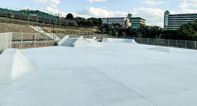 同市初のスケートボード専用スペース。階段や傾斜、低い山の形をしたピラミッドなど、思わず挑戦したくなるセクションが用意されています。