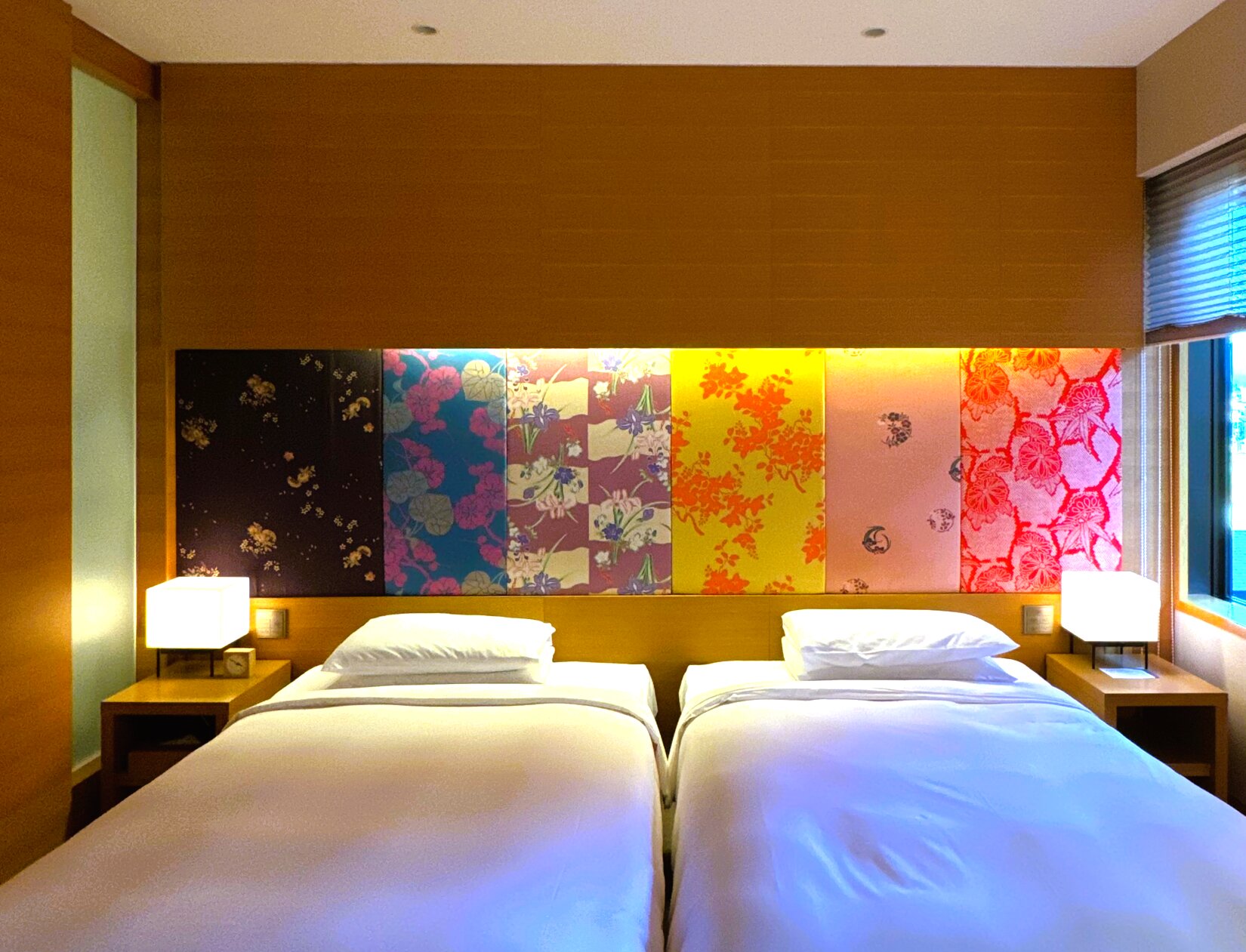こちらの客室は、28平米のツイン。低めのベッドには江戸~大正時代の着物の古布を使ったヘッドボード、行燈(あんどん)を思わせる柔らかな照明など、和の要素を随所に取り入れた、木の温もりを感じるインテリアデザインです。