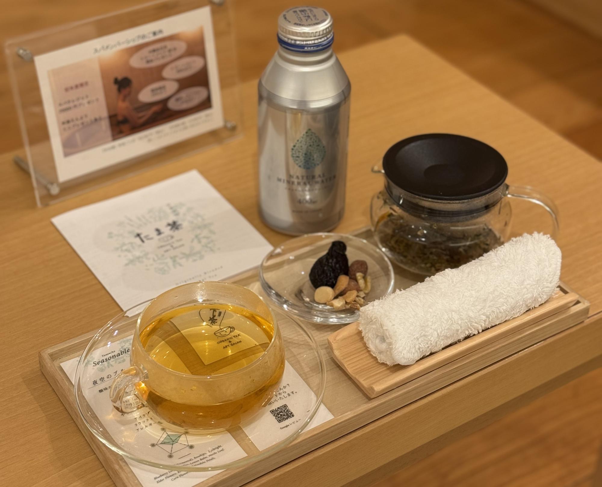 入浴後は「たまちゃ」のハーブティーなども用意されていて、ゆっくり整える時間が続きます。酵素浴利用者はサウナやフィットネスジムを無料で利用可能なのも魅力です。